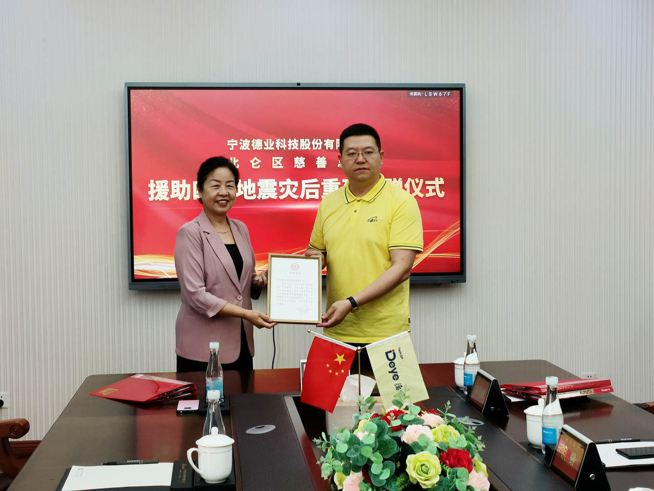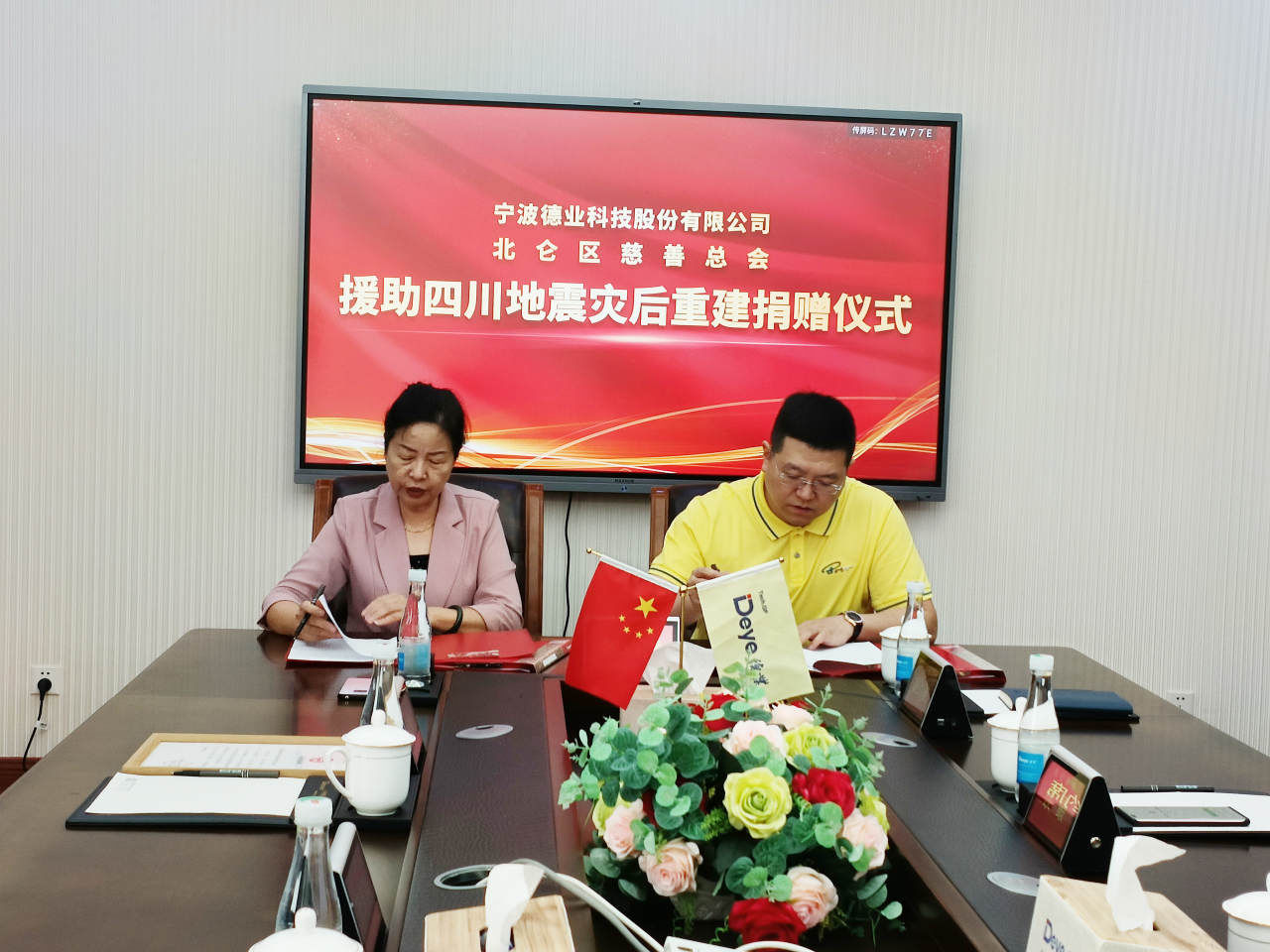 仪式上,宁波德业科技股份有限公司总经理张栋业和北仑区慈善总会会长蒋素春签署慈善捐赠协议。宁波德业科技股份有限公司通过北仑区慈善总会捐赠善款100万元,定向用于四川地震灾后的重建项目。